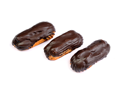 Pruuni šokolaadiglasuuri ning väikeste šokolaaditükikestega rammusa vahukoore-šokolaadikreemiga ekleerid.