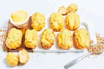 Sidrunimaitselise glasuuriga kaetud ekleeride täidiseks on rammus kondenspiima-vaniljekreem, millele annab särtsu juurdelisatud munaliköör.