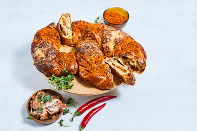 Sastāvā vistas giross, siers, tomātu - čillī kraukšķīši, marinēti šampinjoni, paprika