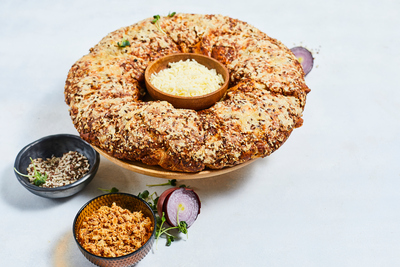 Sastāvā saulespuķu sēklas, linsēklas un sezama sēklas, Mocarella siers, Fetaki siers, klasiskais siers, grauzdēti sīpoli, paprika)