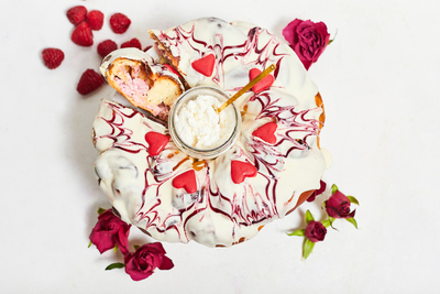 - Savīts kliņģera formā, pārklāts ar aveņu glazūras stīdziņām, sākot no 1 kg lieluma - 1kg, 1,5 kg, 2 kg, 2,5 kg.
