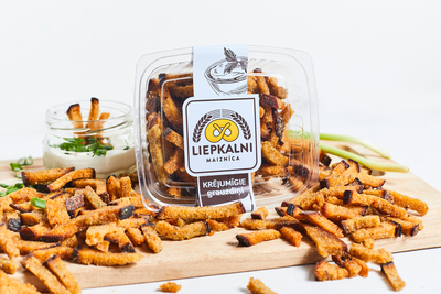 Krõmpsud hapukoorega Koostisosad: peenleib (rukkijahu, nisujahu (sisaldab nisugluteeni), suhkur, rukkilinnasejahu, pärm, keedusool, nisukliid, köömned, antioksüdant askorbiinhape, rapsiõli, maitseainesegu hapukooremaitsega (5%) (sool, maltodekstriin, maitseained, hapukoore lõhna- ja maitseaine), sool