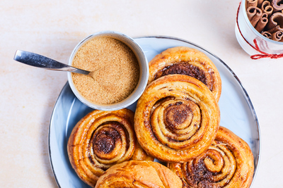 Rikkaliku kaneeli- ja suhkrutäidisega saiake.