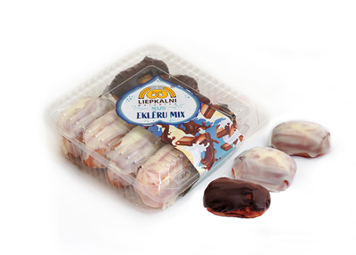 Väikesed valge šokolaadiglasuuri ja maheda vaniljekreemiga ning pruuni šokolaadikatte ja šokolaadikreemiga ekleerid.