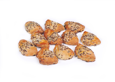 Pärmitaignast pirukas kurgi- ja lihatäidisega, mis kaetud päevalille-, seesami- ja linaseemnetega.
