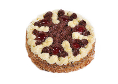 Valge ja šokolaadibiskviidi kihtidest valmistatud keedukreemi ning kirsitäidisega elegantne šokolaadikattega tort.