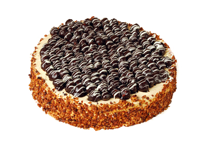 Biskviitpõhja ning karamellikreemiga tort kaetud tervete šokolaadiste sarapuupähklitega.